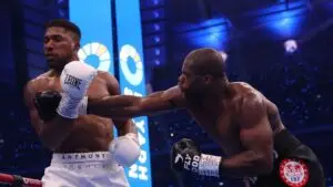 In het begin van de partij, binnen 35 seconden in de eerste ronde, kreeg Anthony Joshua een krachtige rechtse hoekstoot te verwerken van Daniel Dubois.