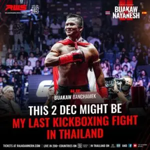 Buakaw heeft verklaard dat RWS: Legend of Rajadamnern op 2 december 2023 mogelijk zijn laatste kickboksgevecht in Thailand