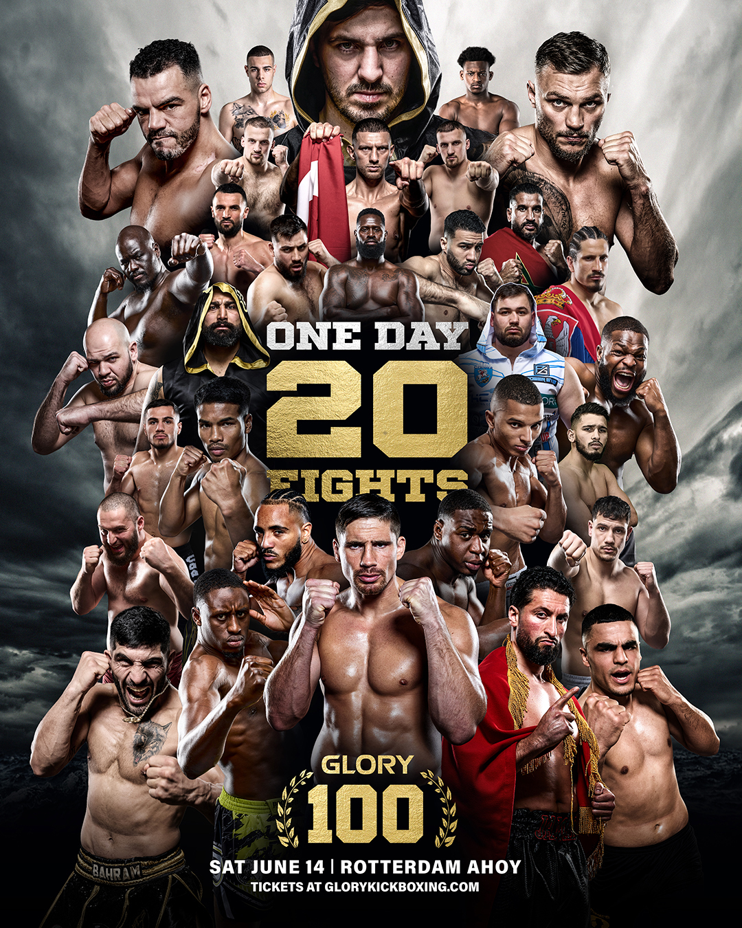 GLORY 100 wordt het grootste kickboksevenement ooit en een van de belangrijkste evenementen in de vechtsport. Het was eerst een evenement van twee dagen, maar nu is GLORY 100 samengevoegd tot één groot evenement op zaterdag 14 juni in Rotterdam Ahoy.