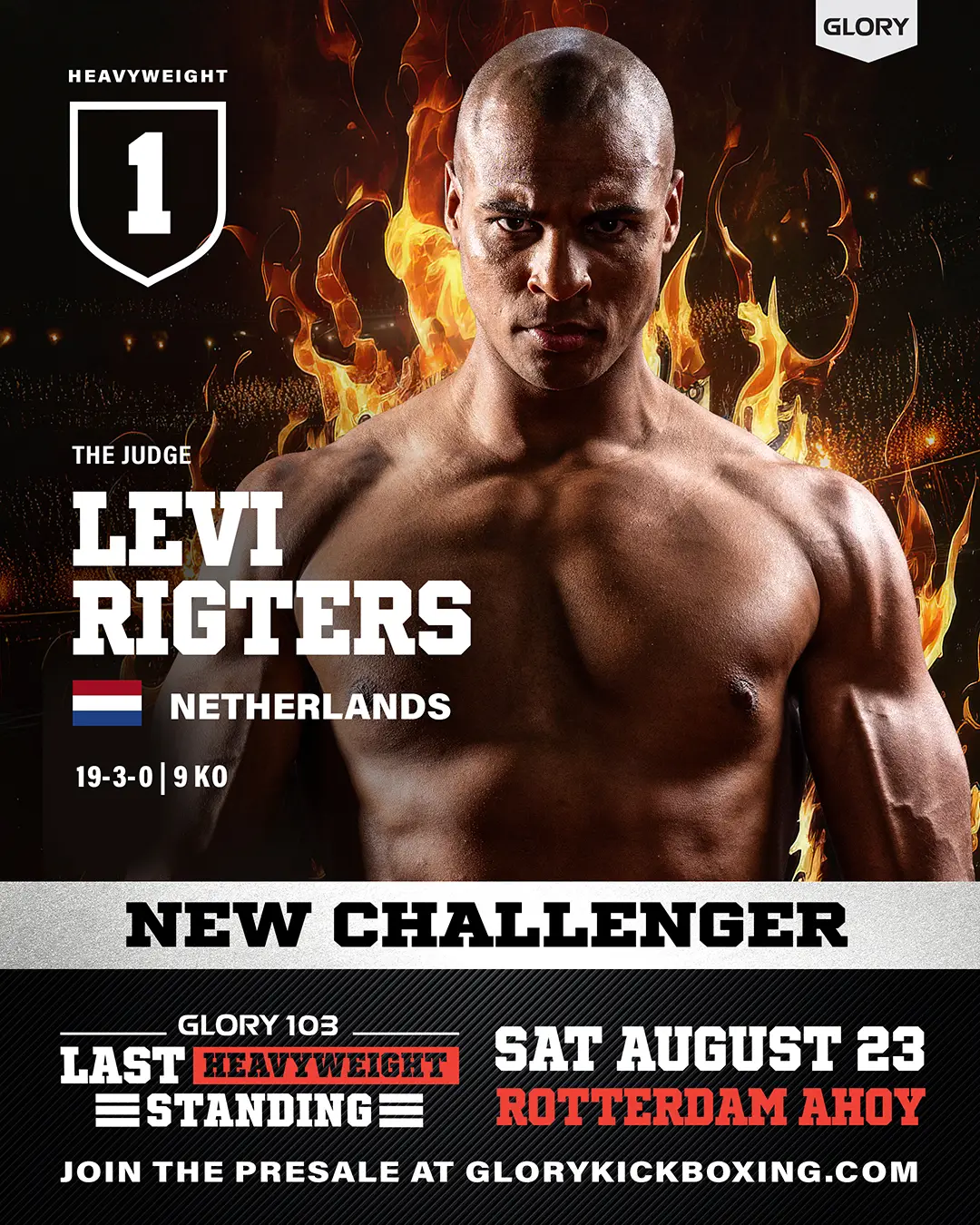 GLORY 103: Last Heavyweight Standing vindt plaats op 23 augustus in Rotterdam Ahoy in Nederland Levi Rigters comeback