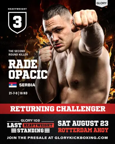 The presale for GLORY 103: Last Heavyweight Standing begins on Thursday, July 3, at 12 p.m. CET. The general sale will start on Friday, July 4 at 12 p.m.