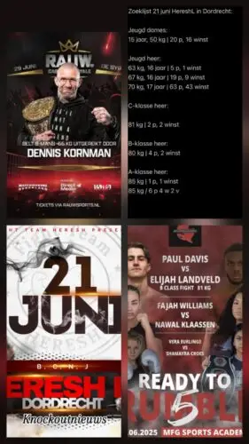 Nog geen week later, op zaterdag 21 juni, staat HERESHL klaar om een mooi evenement neer te zetten in het levendige Dordrecht. Dit evenement is op zoek naar getalenteerde vechters, dus als je ambities hebt om in de ring te staan, is dit je kans! Zelfs als je geen vechter bent, is het de moeite waard om dit evenement bij te wonen. Dordrecht is wellicht een stukje rijden voor sommigen, maar de unieke sfeer en de spannende partijen maken de reis absoluut de moeite waard. Zorg dat je erbij bent en mis het niet!