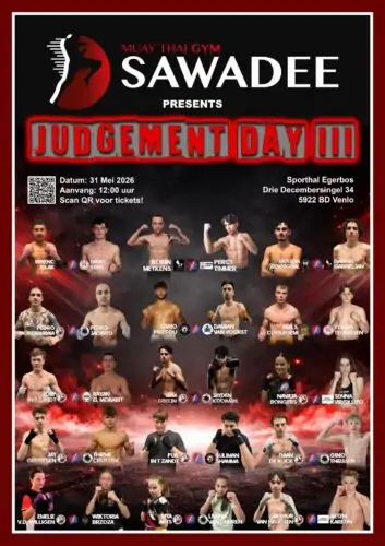 Op zaterdag 31 mei 2026 keert één van de meest spraakmakende vechtsportevenementen terug: Judgement Day III. Bereid u voor op een avond vol adrenaline, spektakel en topniveau gevechten. De voorbereidingen zijn in volle gang en Muay Thai Gym Sawadee kondigt met trots een indrukwekkende line-up aan van circa 40 wedstrijden.