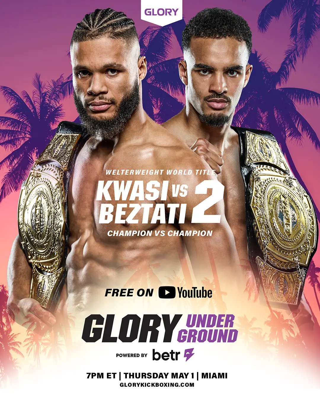 MIAMI, FLORIDA – March 19, 2025 – GLORY, the world’s largest kickboxing organization and a top martial arts company, is partnering with Betr Holdings Inc. (Betr), a major sports gaming and media company. Together they will launch GLORY Underground: Powered by Betr, a new series of exclusive kickboxing matches that will completely change sports entertainment. The first match will be on May 1, 2025 at Betr’s headquarters in Miami, Florida and will be free to watch on YouTube. GLORY is taking a big step forward with this partnership by using Betr’s modern way of creating content and engaging viewers. About 100 special guests have been invited, including well-known people, athletes and celebrities. This event will be followed by another one in the summer of 2025. The date and names of the five fighters, including GLORY’s best stand-up kickboxers and new talents, will be announced soon.