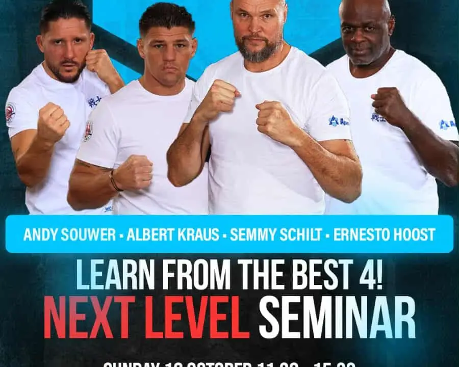 Semmy Schilt, Ernesto Hoost, Andy Souwer en Abelt Kraus genen een seminar op 19 oktober 2025. De locatie is de sporthal DE WIT in Nederland De Bilt Utrecht!